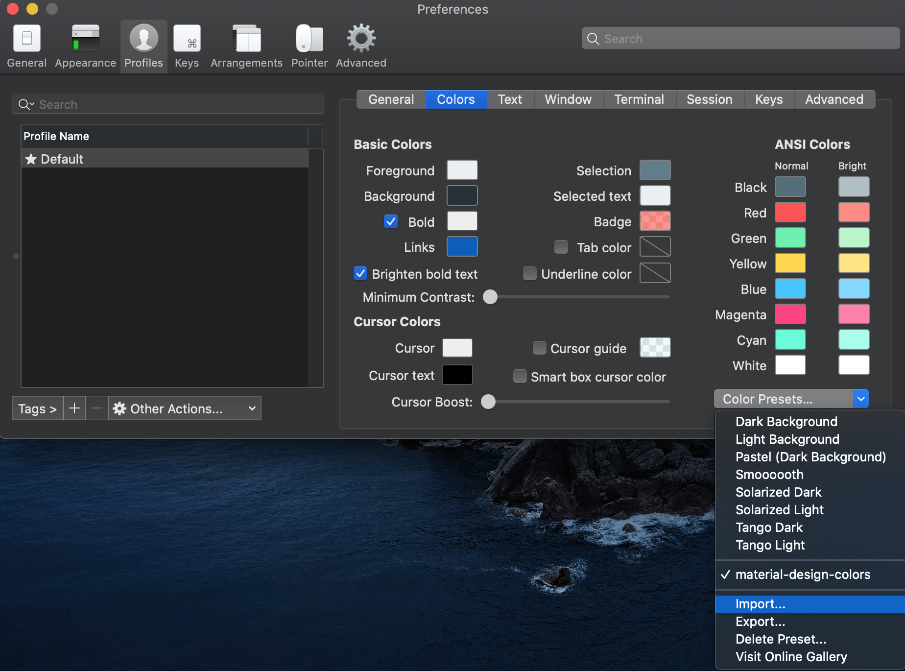 이제 iterm2를 켜서 환경설정(Preference -> Profiles -> Colors -> Color Presets -> import를 클릭한다.