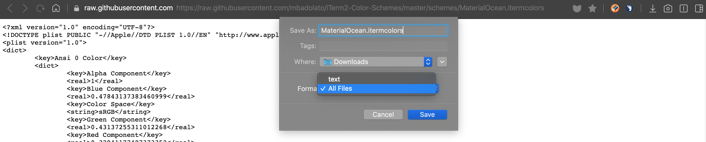 저장 (cmd + s)을 입력하면 아래같은 창이 뜨는데, All Files 포맷에 파일 이름은 .itermcolors가 되게 저장한다