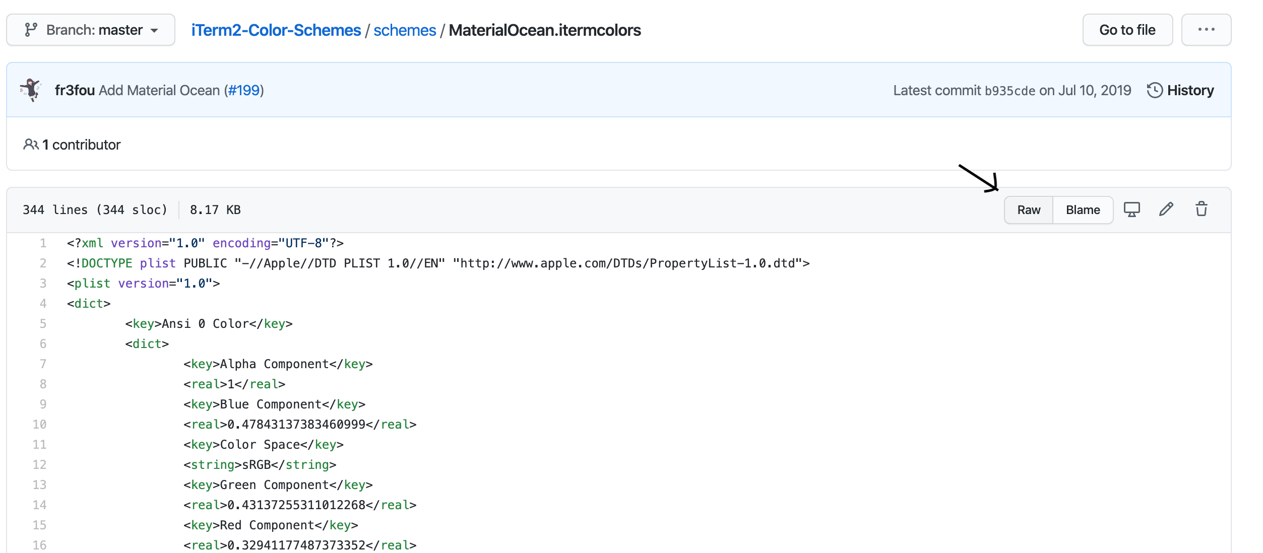 마음에 드는 색상 테마를 검색(Ctrl + f / Cmd + f)해서 Raw버튼을 클릭한다.