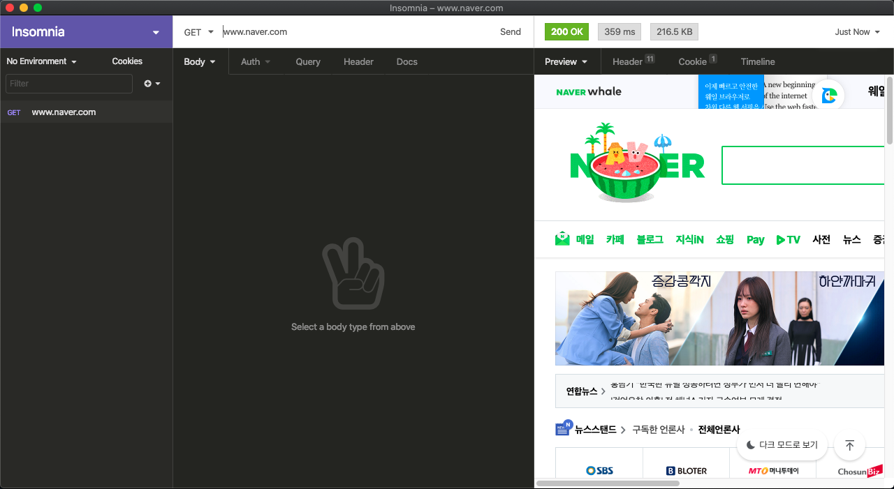 테스트도 해볼겸 naver.com으로 GET 요청을 보내보았다.